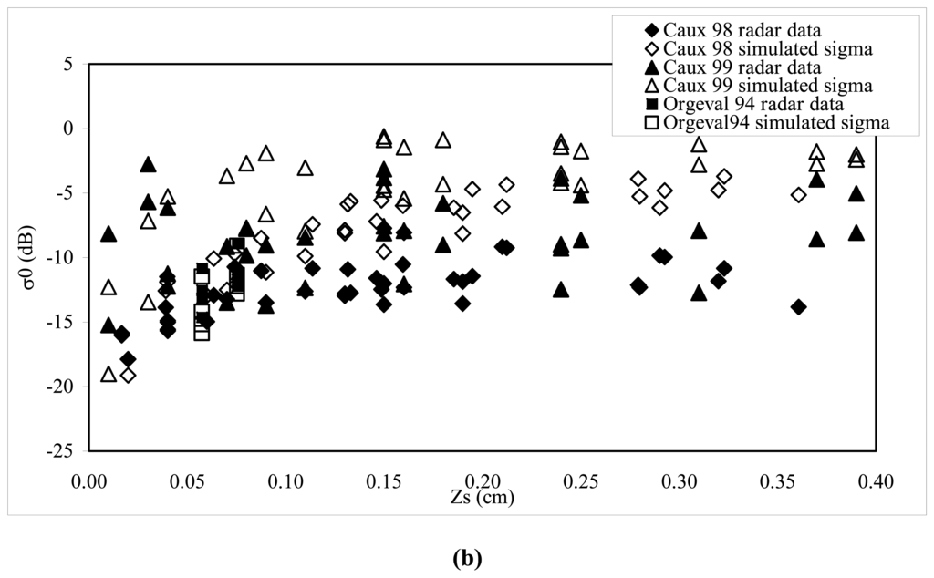 Zribi and Deschambre [] proposed this parameter, defined by s2/l, which is given by the product of the rms height (s) and the slope of the soil surface (s/l). Smooth soils correspond in general to small values of Zs (<0.1 cm), whereas ploughed soils correspond to large values of Zs (>0.1 cm). The discrepancy, between simulated and measured radar signals, increases when the values of the roughness parameter, Zs, reach higher values. This section shows particularly the difficulty of IEM to simulate correctly backscattering over surfaces with highest roughness, even in its validity domain. In the next sections, we present a hypothesis, concerning dielectric constant modelling, which could explain this disagreement for high roughness.