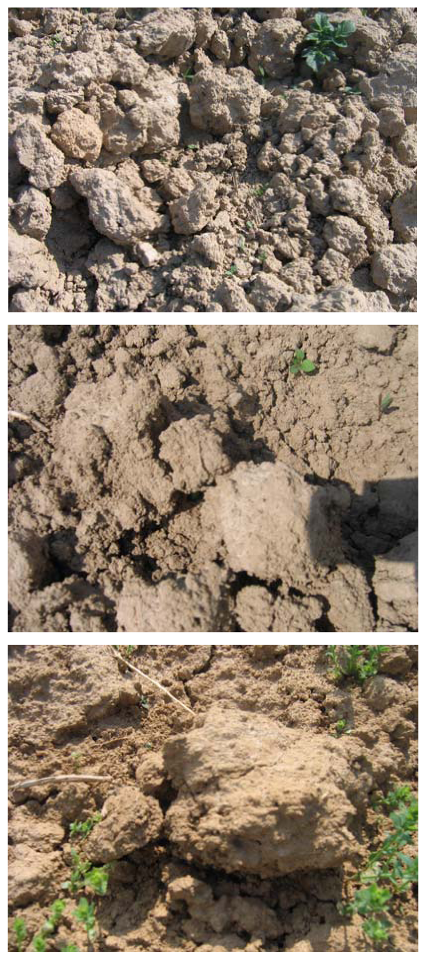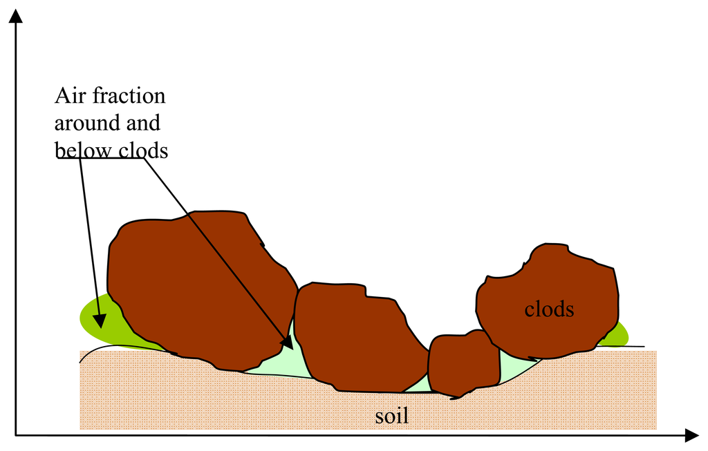 As can be seen in Figure 3, the agricultural soil surface is composed of clods of different sizes, embedded together, with considerable volumes of air between the clods. The presence of air is also observed around and below the clods (Figure 4). When determining the soil's dielectric constant, this air is not taken into account by the dielectric mixing model, which is more specifically adapted to homogenous soils with a smooth surface. In fact, as a general rule, measurements are made without including the presence of air between the clods. In the present case the surface backscattering models, which assume a homogenous soil texture, are not realistic for a large number of surfaces with medium or high roughness.