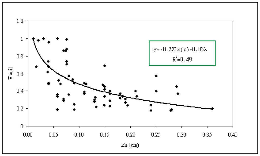 Figure 5 shows how the vsoil parameter varies as a function of the roughness parameter Zs. A correlation can be observed between the soil fraction and surface roughness (correlation coefficient R2 equal to 0.49). This could be explained simply by the fact that, with increasing roughness, we have an increase in the number and size of clods and thus a higher probability of encountering a higher air fraction. We propose the following empirical relationship between Zs and vsoil, derived from the fitted data: