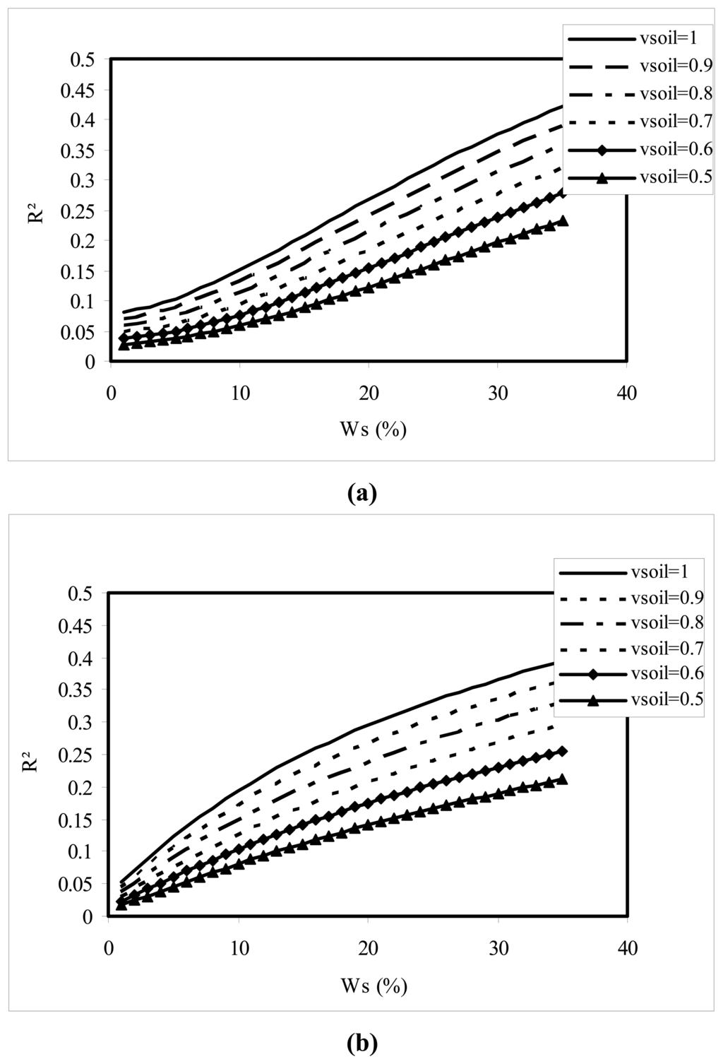Illustration of variations in |R2|, as a function of soil moisture, for different values of the vsoil parameter (vsoil=1, vsoil =0.9, vsoil =0.8, vsoil =0.7, vsoil =0.6), (a) at L band (1.25 GHz), (b) at C band (5.3 GHz).