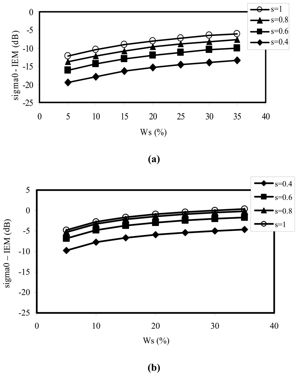 Illustration of IEM simulations, with a classical computation of the dielectric constant, for different values of roughness, as a function of soil moisture. (a) L band (1.25 GHz), (b) C band (5.3 GHz).