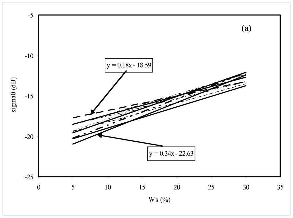 Figure 7 illustrates the variation of backscattering as a function of soil moisture, using IEM simulations, with no modification to the dielectric constant calculation, for the L and C bands. We observe, in particular, a saturation of the simulated signals for volumetric moisture of around 25%. This is not the case for real data, which generally exhibits a linear trend for volumetric moistures up to approximately 35%. On the other hand, in the past, the inversion of radar signals was generally based on a simple linear relationship between the radar signal at a given incidence angle (σ0), and the mean soil surface volumetric moisture (Ws):