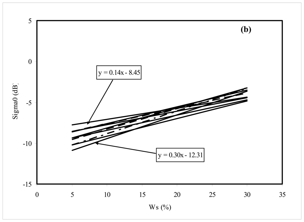 As described in the Introduction, the coefficients describing the linear relationship between moisture and radar signal are often different from one watershed to another and also from one year to another. For example, with ERS/SAR (VV polarisation, 23° incidence angle), the slope is equal to 0.33 for [], equal to 0.28 for [], equal to 0.42 for [], equal to 0.55 for []. In this section, we propose to analyse the effect of air fraction percent on soil composition on the variation of the linear relationship regression coefficients (a and b). In order to understand this influence of the air fraction on a, b, we analysed various different case studies based on IEM simulations. We monitored the surface moisture of one site, on six different dates, corresponding to the successive surface moisture values: Ws1=5%, Ws2=10%, Ws3=15%, Ws4=20%, Ws5=25% and Ws6=30%. On the other hand, we assumed six vsoil parameters: v1, v2, v3, v4, v5, and v6, estimated from a uniform distribution between the values 0.6 and 1. These lead to infinite cases, which could be observed at real agricultural sites. We then simulated backscattering coefficients with IEM for different situations, by mixing one vsoil parameter (between 0.6 and 1) with one moisture value (vl, Wsj, i=1,..6, j=1,..6), for six different dates. Linear relationships between the six input moistures and the corresponding backscattering coefficient IEM simulations were illustrated just for the ten cases in the L and C bands in Figure 8. The values of the coefficients a and b were found to be highly variable, with a in the L band ranging between 0.18 and 0.34 as illustrated in Figure 8-a, with a mean value equal to 0.26, and a in the C band ranging between 0.14 and 0.30 as shown in Figure 8-b, with a mean value of 0.22.