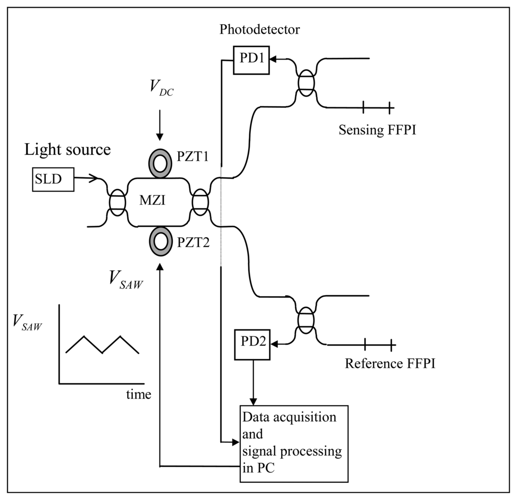 The proposed AFWLI consists of three interferometers, one processing interferometer (AFMZI) and two FFPIs. One FFPI is working as a sensing interferometer exposed to the temperature TS to be measured and the other FFPI is working as a reference interferometer which is protected from environmental disturbances but exposed to the known reference temperature TR. In this set-up the AFMZI is scanned to match the phase of the MZI to that of the sensing FFPI, such that AFMZI and sensing FFPI are coherently matched and interfered. The processing AFMZI has two PZTs in its two arms. A constant D.C. voltage VDC (100∼150 [volt], Figure 1 and Figure 2a) is applied to the PZT1 in one arm to coarsely match the OPD of AFMZI to that of the sensing FFPI within the coherence length of the light source. An alternating ramp voltage VSAW (Figure 2a) is applied to PZT2 in the other arm to scan the processing interferometer so that the zero order fringe peak for each FFPI occurs when its round-trip OPD exactly matches the OPD of the MZI.