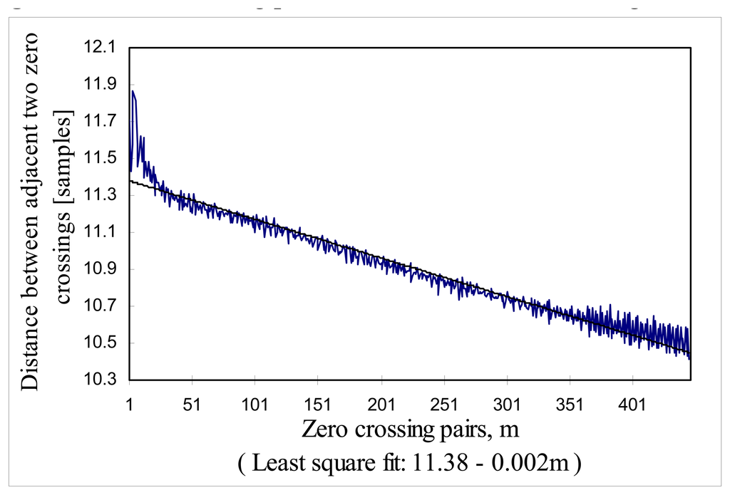 The distance of m-th zero crossing pair (m=1, 2,..,450) of the j-th ( j=1∼100) scan was stored in Z(m,j). The average distance of the m–th zero-crossing pairs of 100 scans were stored in Zavg(m). Figure 10 shows the zero crossing period changes of 450 zero crossing pairs, Zavg(m).