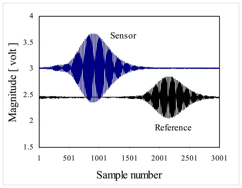 After turning the system on VDC applied on the PZT1 was adjusted in order to make the path length difference between AFMZI and the sensor FFPI (and also the reference FFPI) larger than the coherence length of the light source. This adjustment eventually made the interference fringe totally disappeared on the oscilloscope screen. At this condition, noise voltage level of the reference FFPI and the sensing FFPI were 0.005 [volt]. and 0.008 [volt]. respectively when SLD forward current IF(SLD) = 80 [mA]. And peak-to-peak signal voltage level of the reference FFPI and the sensing FFPI of the interference fringe pattern were approximately 1.7 [volt] and 1.4 [volt] respectively during the sensor system operation. Then SNR of the reference FFPI and the sensing FFPI were calculated as 50 [dB] and 44 [dB], respectively.