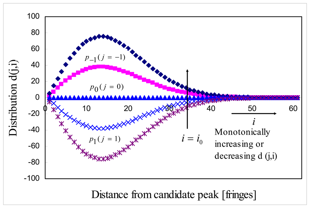 where p1 is the positive first order fringe peak, p-1 is the negative first order fringe peak and so on. In other words, hypothesis test presumes each candidate peak is the zero order fringe peak and calculates the parameter g(pj) in Eq. (13). Then, for zero order fringe peak p0g(p0) is given as: