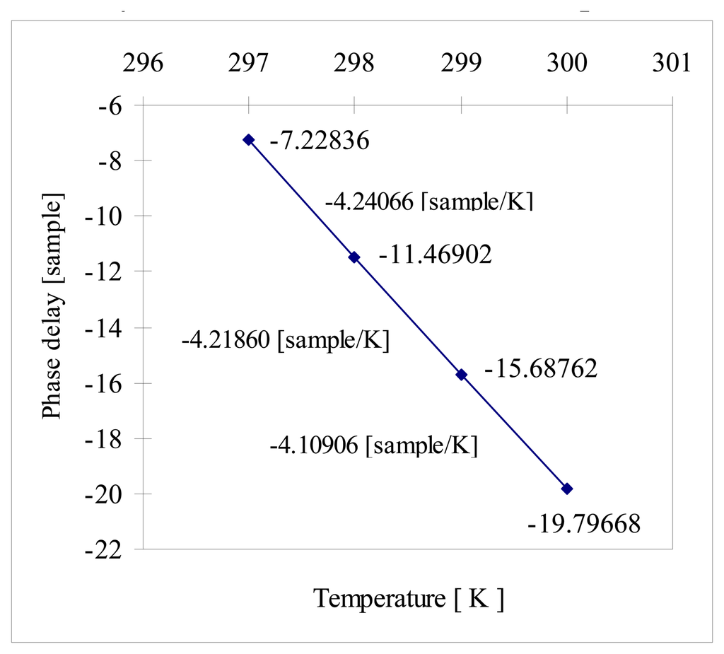 Figure 4 shows the phase delay decrease between temperatures measurements. Note that difference of mean phase delay between temperature measurements (slope of straight line segment in Figure 4) was -4.24066, -4.21860, and -4.10906 samples/K.