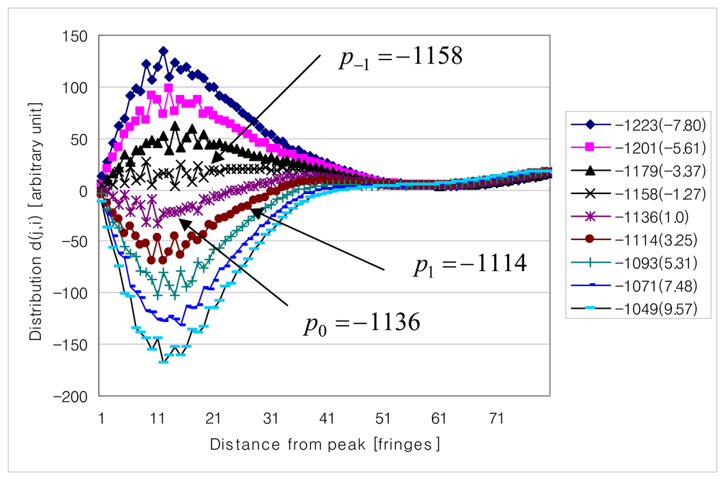 Figure 6 is the distribution d(j,i) of fringe scan H373. The legend of Figure 6 shows the zero order fringe peak candidate pi and its corresponding parameter g(pj) normalized with respect to the smallest g(pj). Some entries of d(j,i) for p0 = –1109 are noisy and have a crossover at which value of d(j,i) is changing from a negative to a positive value. This means that fringe scan is not as symmetric as the ideal case shown Figure 3, but the distribution d(j,i) for p0 = –1109 still shows the dominant candidate p0 = –1109 producing the smallest g(pj).