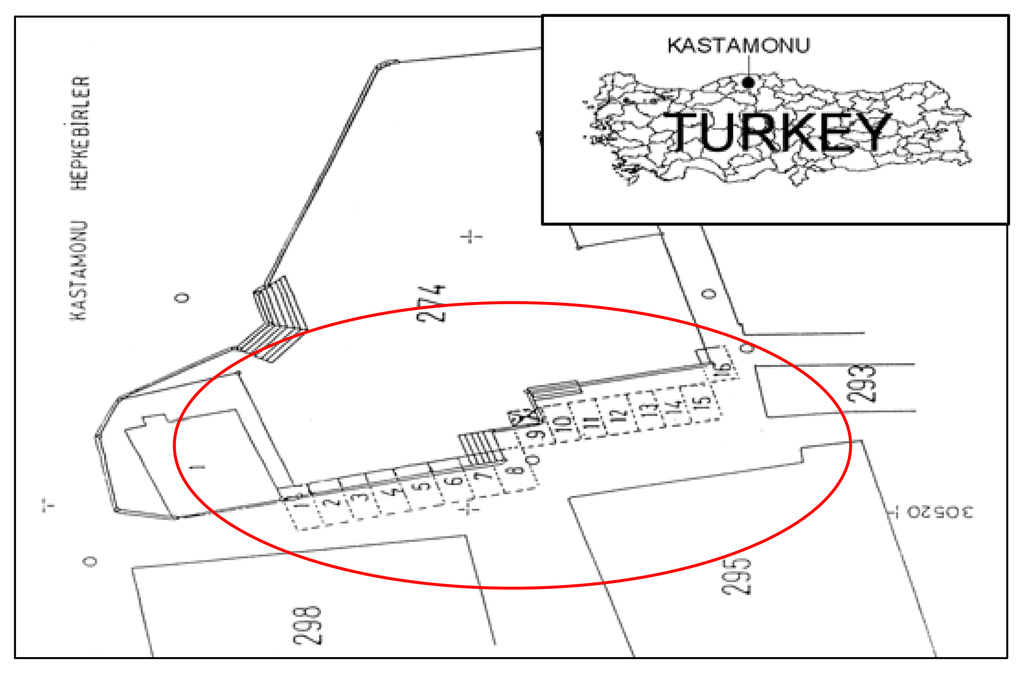 As shown with striped lines in Figure 6, some shops were constructed under Mutaflar Street. The land part (parcel 274) containing the shops underneath was registered as a road attribute in the name of Kastamonu Municipality and shops were registered as a right of easement.