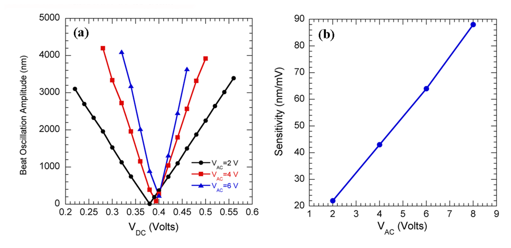 The sensitivity data for uncoated Si cantilevers is shown in Figure 2(a), in which the amplitude of beat oscillations is plotted against dc bias for ac biases of 2, 4, and 6 V. Figure 2(b) shows the sensitivity plotted against the applied ac bias. The sensitivity is calculated as the rate of change of amplitude with dc bias, and expressed in nm/mV. From Figure 2(b), we see that the sensitivity increases linearly with the ac bias which directly follows from Eq. 1. The rms noise (calculated as the standard deviation of the beat amplitude as a function of time for constant ac and dc biases) corresponding to this sensitivity was found to be less than 20 nm. The maximum sensitivity obtained for our present setup was 360 nm/mV. So the minimum change in surface work function that can be resolved is calculated as 55 μV [= (20/360) mV].