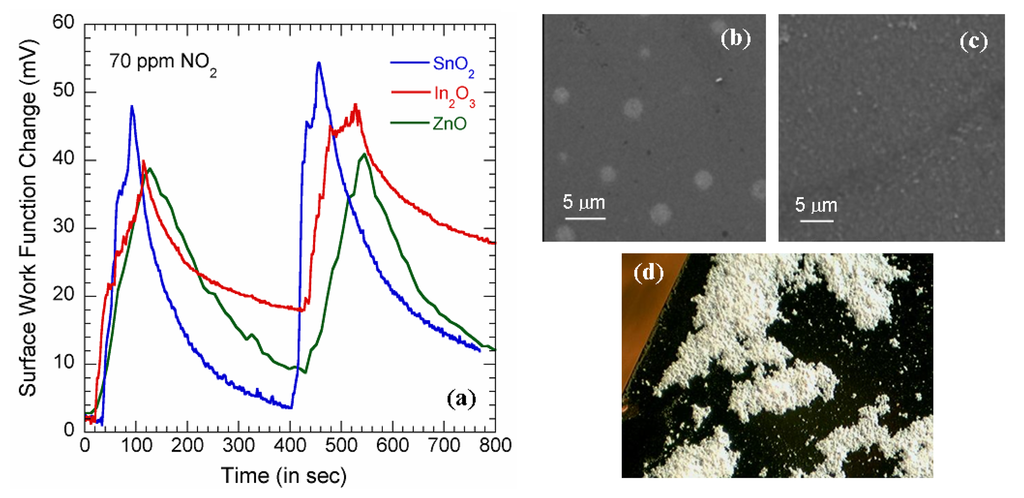 Measurements were performed on In2O3 and SnO2 thin films to investigate the surface work function responses with the adsorption of NO2 molecules. Figure 3(a) shows the surface work function (SWF) transients measured on In2O3 and SnO2 thin films when 70 ppm NO2 flow was turned on and off for two cycles. The oxide thin films were highly insulating (resistivity > 1 TΩ/□ which is believed to be due to the presence of high defects in the material. Such films were unsuitable for any amperometric measurements; however they showed significant response in the SWF where the initial rates of change in SWF of ∼80 and ∼100 μV/sec, respectively, were found for In2O3 and SnO2 [Figure 3(a)]. Figures 3(b) and 3(c) are the SEM images of the surface of the In2O3 and SnO2 thin films which show that they had fairly even surfaces. However, the In2O3 films show presence of tiny bubble shaped morphology with average diameter of around 3.5 μm [Figure 3(b)] that might have grown due to emission of any gaseous species during high temperature annealing. However, any error that is incorporated due these spots can be neglected since the dimension of the cantilever is relatively large (350μm × 35μm) with respect to these bubbles. To further investigate the efficacy of the potentiometric technique, we performed the NO2 sensing measurements on ZnO nanoclusters. ZnO has been proved as sensing material for various gases [32]; recently ZnO nanowires FET has also been demonstrated as an efficient NO2 sensor in sub-ppm range [33]. The ZnO nanowires we used for our experiments were deposited on Si substrate by sonication.