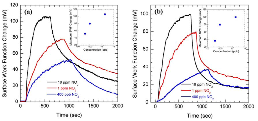 SWF changes of (a) SnO2 and (b) In2O3 thin films as 18, 1 and 0.4 ppm NO2 flow was switched on and off. Insets show maximum SWF changes plotted against the concentration of NO2.
