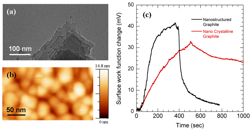 (a) TEM image of nanostructured graphite particles. (b) AFM morphological image of nanocrystalline graphite (c) Surface work function changes with the flow of 400 ppb NO2 using nanocrystalline graphite (NCG) and nanostructured graphite (NG). NG shows higher sensitivity than NCG