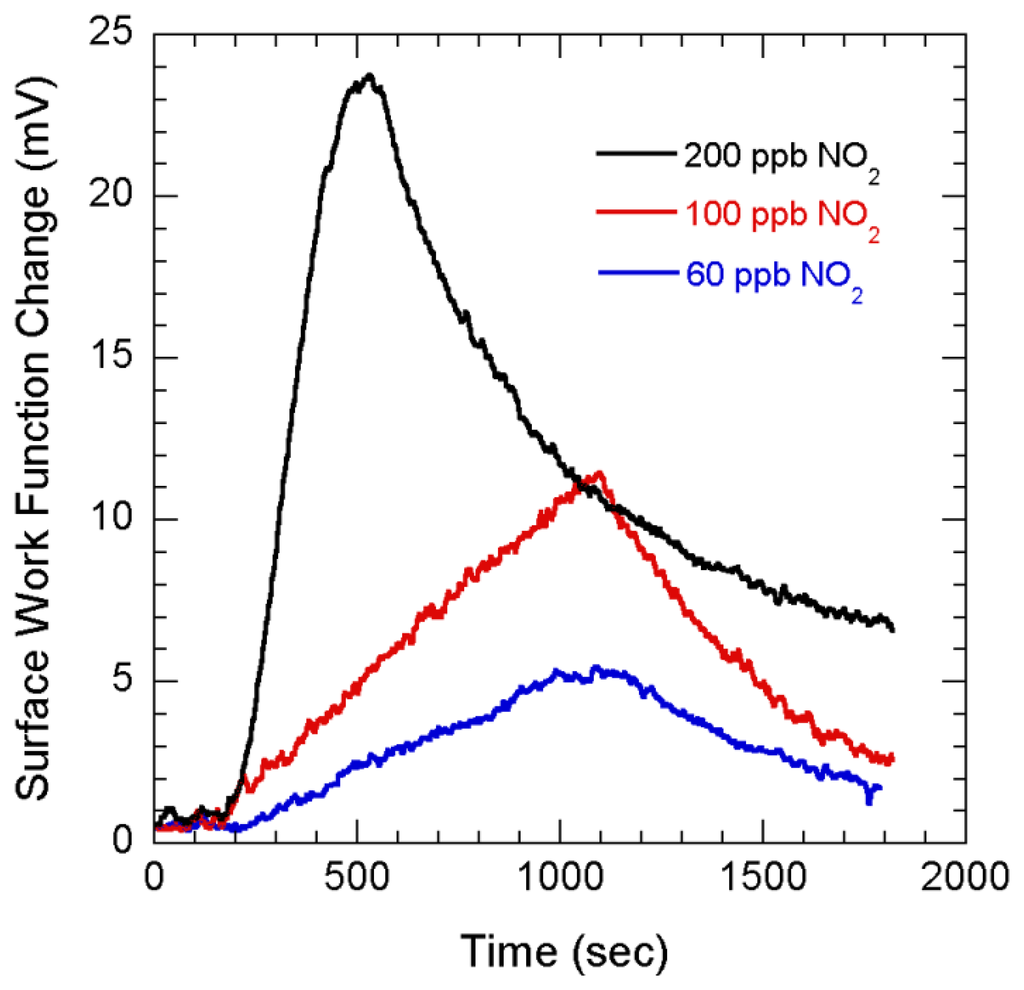 Surface work function changes of NG layers with flow of 200, 100 and 60 ppb NO2.