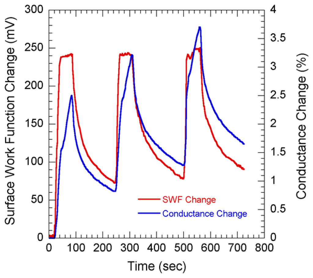 The main advantage of the potentiometric technique is that it is entirely based on the surface properties of the sensing materials. On the other hand, the amperometric technique (which detects the conductance change of the material with adsorption of target molecules) relies on the adsorption process as well as the diffusive property of molecules through porous graphite. In case of molecules which do not create significant conductance change, potentiometric measurements can be a better tool since the orientation of the molecule can allow significant change in SWF. Figure 7 shows the comparison for simultaneous current and SWF measurements on NG layer with 3 cycles of 100 ppm NO2 flow. Carbon is a highly conductive material, so to realize the amperometric measurements, very thin layer (< 1 μm) of NG was deposited on insulating material such as ceramic.