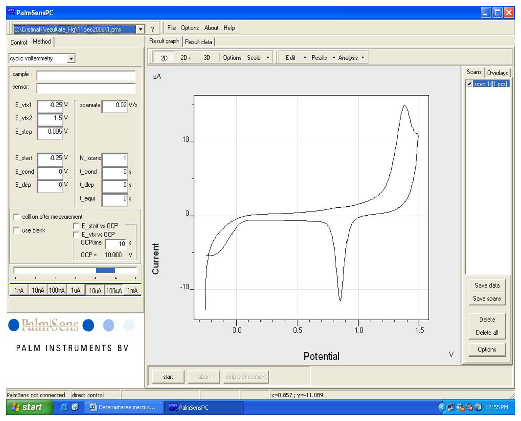 An electrochemical cleaning of the working electrode has been done first: 0.2 M H2SO4 solution (10 mL) was placed in the electrochemical cell and the potential was scanned five times in between -0.25 ÷ +1.5 V. The potential scanning rate was 0.02 V/s. Usually, the last three-recorded voltammograms are practically identical (they overlap each other) and that indicates a proper electrochemical cleaning of the electrode in the first two scannings. Cleaning was repeated if the last two voltammograms do not overlap. After that, electrodes were thoroughly cleansed with bidistilled water.