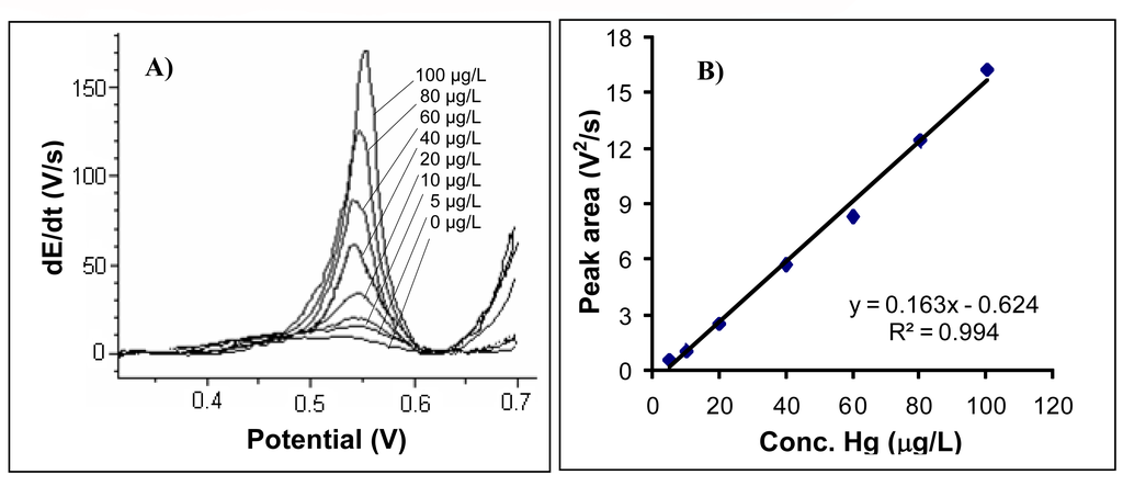 Golimowski et al. [14] employed gold disk electrodes for determining mercury in residual waters by a voltammetric method. Daniele et al. [15] made a system for remote monitoring of mercury by potentiometric stripping and square wave stripping voltammetry by means of gold wire microelectrode. This analytical method was used for mercury determination in the Venetian Laguna.