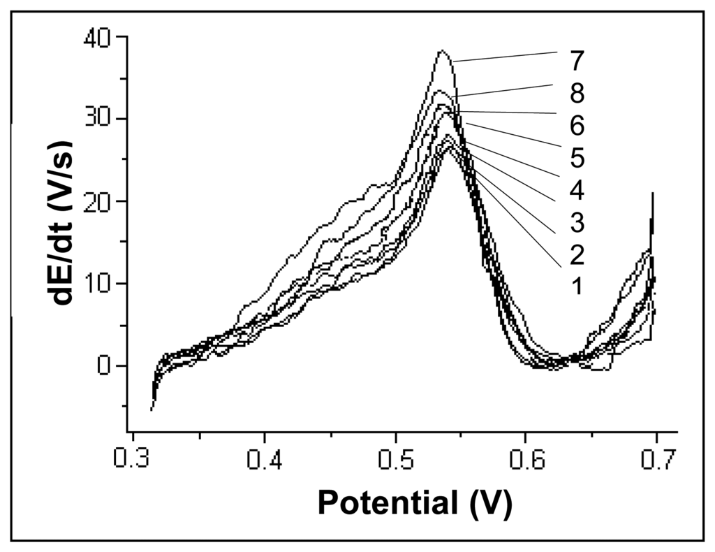Literature data [17] suggest that Cu(II) ions, with a deposition potential close to the one of Hg(II), can interfere in mercury determination. In Figure 7, the chronopotentiograms registered for a mercury concentration of 20 μg/L are presented when different amounts of Cu(II) were added to obtain final Cu(II) concentrations of 0, 20, 40, 100, 200, 400, 500 and 1000 μg/L.