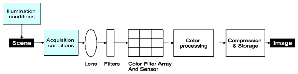 Environment-dependent (blue boxes) and camera-related (white boxes) factors involved in the image acquisition process.