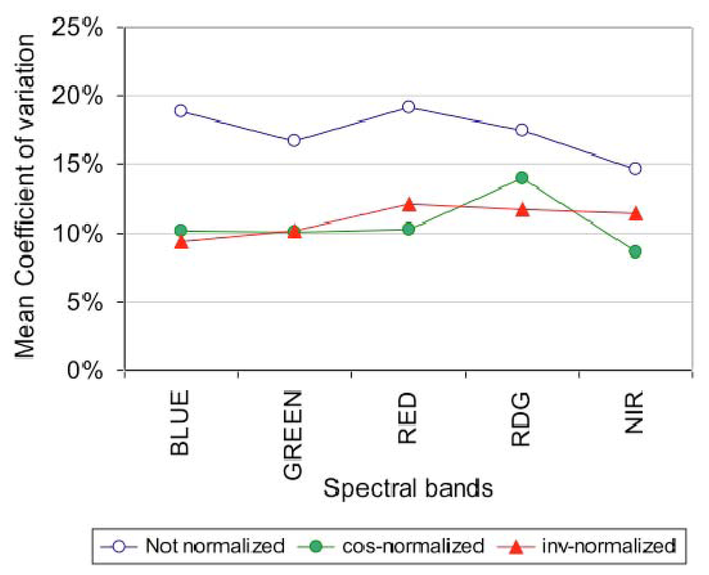 Comparison of different methods of radiometric normalization based on artificial invariant targets: no normalization, cosine and invariant methods. The mean coefficient of variation (CV) is the average of CV of the four artificial targets' digital numbers measured over the acquisition period.