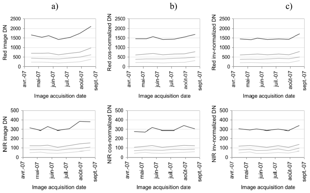 Ultimately, the radiometric normalization between images still remains a problematic operation. Radiometric normalization using scene invariant targets and linear regression calculations for each spectral band has the advantage that it takes into account variations in incident radiation in each band (this is not the case when using spectral indices [7]. But the invariant method is also more time consuming because it involves additional image processing. Artificial targets generally suffer from insufficient size (often the size is no larger than five pixels) and logistical constraints. Natural targets are generally not invariant, except in the case of bare soil or buildings that are not representative of the vegetation spectral range that we are interested in. In our case, the radiometric normalization using invariant points increased the noise of the vegetation indices because the errors in the Red and Near Infrared bands were cumulative. When working with individual spectral bands, we recommend using the solar zenith angle correction. This simplified radiometric correction is valuable because acquisitions are generally conducted under clear sky and at around midday, and they therefore are captured under similar atmospheric conditions. Furthermore, this method can be used only if the camera settings are manually adjustable and remain unchanged during the experiment. In case of change in camera settings, [36] developed a calibration method for using digital cameras as luminance meters that is independent of exposure settings.