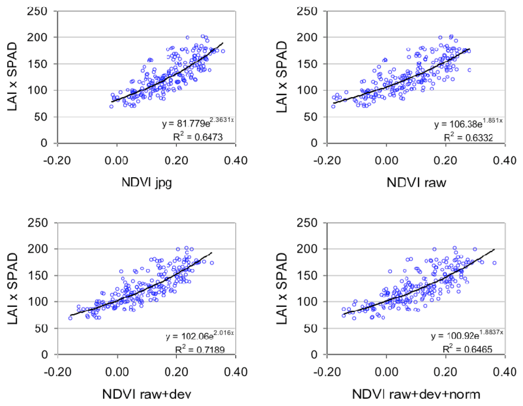 Fitted exponential functions between the Chlorophyll Content (LAI*SPAD) and NDVI for the 36 experimental plots across six dates. NDVI is calculated from the Red and NIR images at different levels of radiometric corrections (jpg = JPEG format; raw = unprocessed format; dev = vignetting-corrected; norm = normalized by invariant targets).