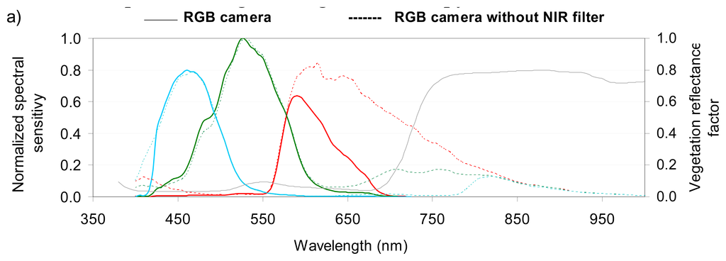 Normalized spectral sensitivity of CANON EOS 400D cameras: (a) the original (RGB) and modified (without NIR filter), (b) the original (RGB) and modified (RDG and NIR). The colours of the lines correspond to the camera channels. The grey line is a standard reflectance profile of a green vegetation canopy.