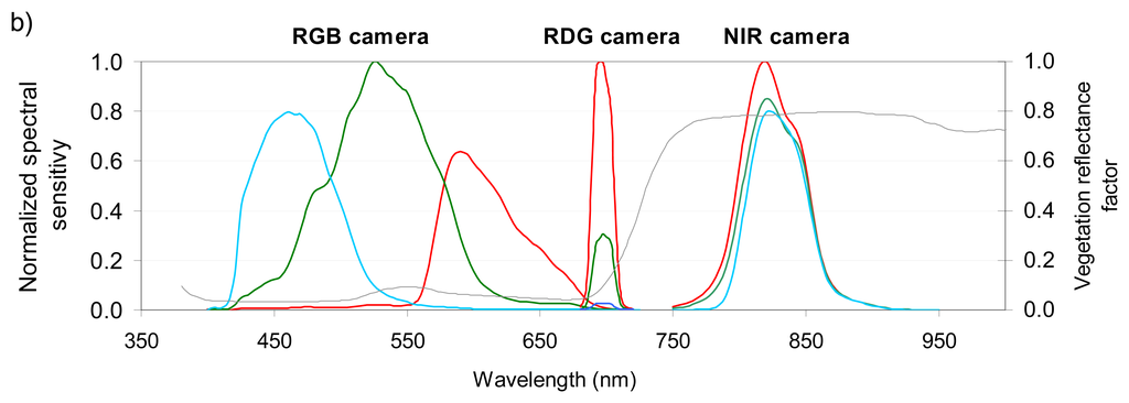 We used three Canon® EOS 400D digital cameras (10.1 Megapixel CMOS sensor); each of which had a focal length of 35 mm. The spectral sensitivity of the three cameras was measured in the laboratory with a monochromatic source 1.2 nm wide [23-24]. The original camera measured radiation in Red, Green and Blue spectral bands (Figure 2a), and is hereafter referred to as the RGB camera. The other two cameras were modified to allow them to detect radiation in additional spectral bands (Figure 2b). The modification consisted of removing the original internal NIR high-pass filter (Figure 2a) and adding specific band-pass filters [8, 15]. One camera was then equipped with an external band-pass Oriel filter (690-709 nm 50% cut), and the other with a LDP LLC XNiteBPG filter (808-855 nm 50% cut); these cameras are hereafter referred to as the RDG (Red-edge) and the NIR (Near Infrared) cameras. Figure 2b shows that the wavebands are broad for the RGB camera, and especially narrow for the RDG camera. If we consider the standard spectral profile of a green vegetation canopy, our results also indicate that the RDG is located at the beginning of the slope between the red and near infrared spectral domains.