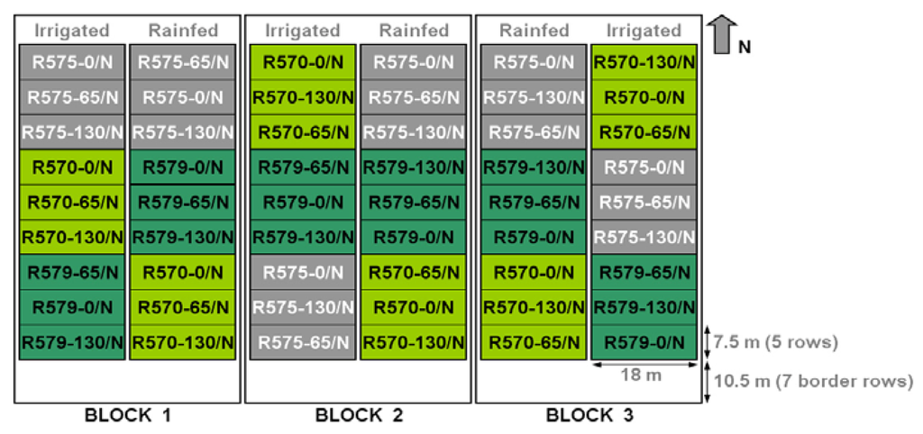 The sugarcane experimental field is located in La Mare, Sainte Marie (Lat 20.9°S; Lon 55.5°E), in the northern part of Reunion Island (average altitude of 60 m). The field was divided into three randomised blocks cultivated with three cultivars of sugarcane (R570, R575, R579) under three different nitrogen inputs (0/N, 65/N, 130/N) and two water treatments (irrigated and rainfed) (Figure 3). For each combination of treatments (cultivar, nitrogen, irrigation), the size of the plot in each block was 135 m². Each comprised 5 rows 18 m in length, with a 1.5 m inter-row separation.