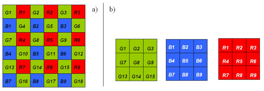 The CANON cameras produce their images by means of a Bayer matrix (or Bayer CFA) whereby each individual pixel is filtered and coded as red (R), green (G) or blue (B) (Figure 4). As explained in the introduction, for most commercial cameras, a “black box” proprietary interpolation algorithm is applied to the Bayer matrix to calculate a full frame RGB image which simulates a realistic appearance for the human eye. The image radiometric resolution is often lowered during this operation (generally from 12 to 8 bits) and compressed (using JPEG format). In order to preserve the information contained in the image, we worked with the unprocessed CMOS data files (CR2 format for CANON cameras). To decode these unprocessed images, for which the camera manufacturer does not always provide decoding software, we used IRIS 5.5, a free software package available on the web (Buil C., personal communication; http://www.astrosurf.com/buil/iris/iris.htm). This software is based on a portable open source program, dcraw (Coffin D., personal communication; http://www.cybercom.net/∼dcoffin/dcraw/) which supports most RAW formats and is available on most operating systems. IRIS splits the CR2 files into four monospectral images, each corresponding to a spectral band (G, G, R, B). The resulting output images (1,953 × 1,301 pixels) are four times smaller than the originals. [13] who also used the dcraw program, demonstrated perfect linearity between the DN of decoded images and quantum sensor measurements.
