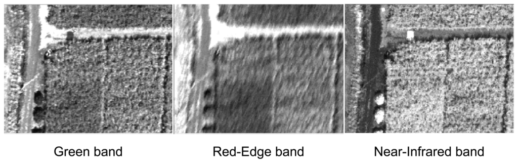 The images acquired from the ultra-light aircraft (ULA) were generally neat, with good contrast in the visible and NIR bands (Figure 5). The quality of the Red-Edge images was less satisfactory with a fuzzy rendering (motion blur) certainly due to the combined effects of exposure time and aircraft vibrations.