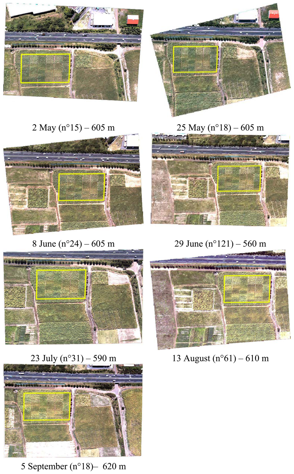 “La Mare” time series of visible images (BGR) taken at an aircraft altitude between 560 m and 620 m. The experimental field is identified by a yellow boundary.