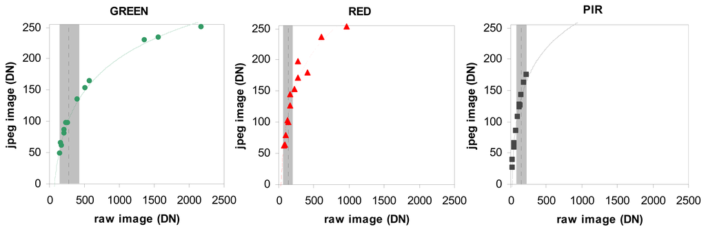 Comparison of the digital numbers (DN) of an image in unprocessed (RAW) and JPEG formats. Logarithmic curves are drawn for each band. Dotted lines represent the mean raw DN measured on vegetation. Grey zones represent mean ± 2 standard-deviations.