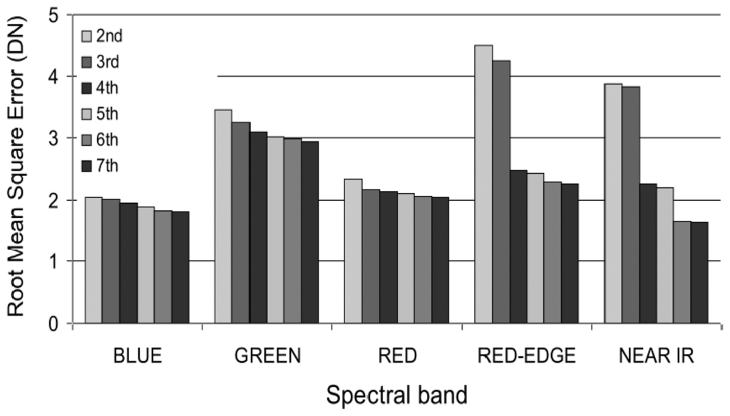 For each spectral band, we calculated a vignetting correction filter by fitting a polynomial function distribution onto an average image computed over the whole data set (about 500 images acquired in different locations and at different altitudes). This vignetting distribution function expresses the vignetting factor for a given position in the image as a polynomial function of position (i.e., row and column coordinates). Different degrees of polynomial were tested for each band and the resulting Root Mean Square Errors (RMSE) are as shown in Figure 8. In the visible (R, G, B) bands, an increase in the polynomial degree led to a small decrease in the RMSE. In the RDG and NIR, a significant decrease of the RMSE occurred between the 3rd and 4th degree. A second decrease between the 5th and 6th degree was observed for the NIR band; the 6th degree polynomial resulted in a good fit at the centre and corners of the image (Figure 9). These results led us to choose a 3rd polynomial degree function to correct the vignetting effects for the RGB, and a 4th and 6th polynomial degree function for the RDG and NIR, respectively.