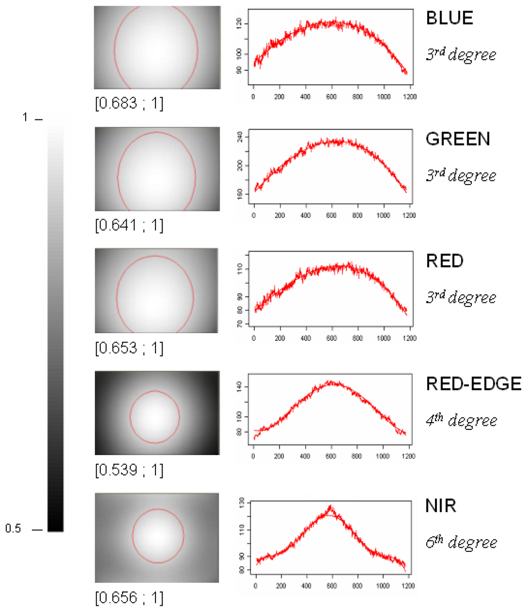 Once the optimal polynomial function had been found, we produced a vignetting filter image for each spectral band (Figure 9). Analysis of the filters indicated that the images taken with the RGB camera showed similar vignetting profiles, characterized by a smooth decrease in the signal (cosine-type function) as the distance from the centre increased. The signal attenuation was as high as 35% at the corners of the image. In the Red-Edge band the vignetting profile was somewhat sharper, and the loss reached 46% in the corners. The vignetting profile of the NIR images displayed a sharp shape, and attenuation of up to 35%. The shape of the vignetting profile seems more pronounced as the wavelength increases (from the visible to the NIR). Furthermore, in all bands the mask pattern was not symmetrical; recorded maxima were slightly shifted from the centre of the image.