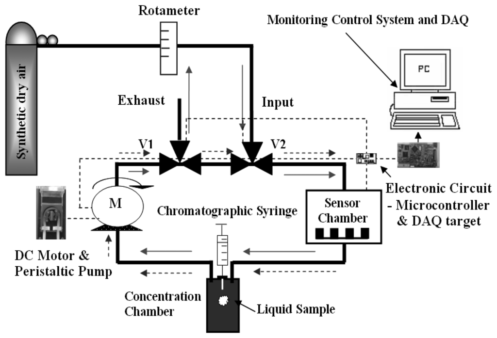 To achieve a flow-modulation capable sniffer, a closed loop system was designed which was based on a PC-controlled peristaltic pump and two three-way electro valves. Figure 1 shows the configuration devised. The stainless-steel sensor chamber housed three commercially-available Taguchi 8-series sensors (i.e. TGS-800,822 and 826). The system had two operating modes (cleaning phase and measurement phase). In the cleaning configuration, pure dry air enters the system through the first electro valve and cleans the peristaltic pump, the sensor chamber and the evaporation chamber. Solid arrows in Figure 1 mark the flow of clean air in this mode. In the measurement mode, air re-circulates in the closed circuit indicated by dashed arrows in Figure 1. Initially, the flow is kept constant at 250 sccm and a calculated quantity of a given pollutant in the liquid phase is sprayed into the evaporation chamber using a chromatographic syringe (since temperature, pressure and system volume were known, the volume of liquid to be injected could be calculated with the ideal gas theory [11]). This allows for obtaining the steady-state response of the sensors. Then, a square-wave flow modulation at a given frequency is initiated, which allows for measuring the transient response of the sensors. The system can generate other types of waveforms such as sinusoids or sawtooth functions, although they have not been used in this study.