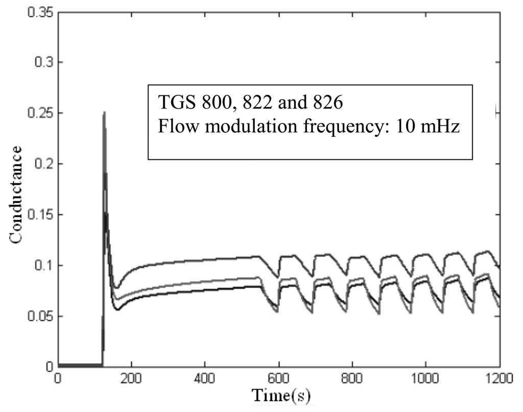Additionally, a temperature sensor was located inside the sensor chamber (placed perpendicular to the flow and between the chamber inlet and the gas sensors) so the effect of flow modulation in the temperature of the chamber (and hence in the operating temperature of the sensors) could be estimated. It was found that, no matter the flow modulation frequency applied, the temperature fluctuations inside the sensor chamber were never higher than ± 0.2°C. Such as small temperature variation confirms that the response patterns observed in Figure 2 are due to the effective modulation of analyte concentration and not to a periodic heating and cooling of the sensors.