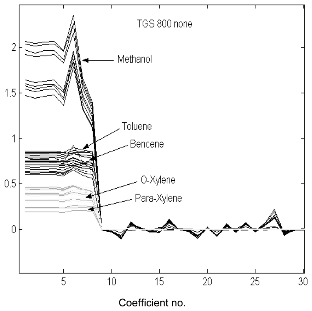 In order to perform the DWT of the pre-processed sensor transients, the fourth Daubechies function (db4) was used as the mother wavelet. This choice was based on our previous experience with temperature-modulated metal oxide gas sensors [8, 12]. The first eight wavelet coefficients of the fifth-order decomposition of the signals were retained for further processing. Figure 3 shows the results of the wavelet decomposition for the transient response of sensor TGS 800 when the flow modulating frequency was 10 mHz and no pre-processing was employed. The values of the first 8 wavelet coefficients for methanol, o-xylene and p-xylene appear well apart, suggesting that these species would be easily discriminated using this sensor. On the other hand, the coefficient values for benzene and toluene clearly overlap, which implies that these volatiles would be hard to discriminate.