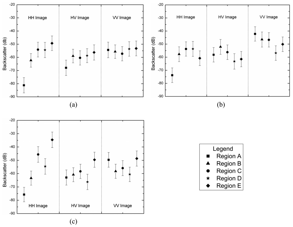 Mean backscatter values for each image region, per channel: (a) L-, (b) C- and (c) X-bands.