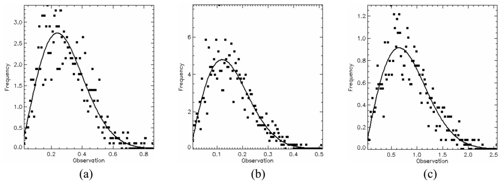 In order to test the hypothesis that the generated SAR data has a square root of gamma distribution, a χ2 goodness-of-fit test was performed for all channels using only one sample of each image region. This sample has size of 1200 pixels since it was formed by grouping the training and test sample sets. The test was applied to amplitude data and their resulting p-values are listed in Table 2. The lowest p-value (11.51%) occurs for HV channel in C-band. Therefore, there is no evidence to reject the hypothesis that all regions for any channel in the three bands are homogeneous areas and exhibit a square root of gamma distribution. The p-values of χ2 goodness-of-fit test for each channel in each band are shown in Table 2, where the largest p-values are typed in bold face. The data histogram (square symbols) and their corresponding fitted distribution (solid line) for these largest p-values are shown in Figures 12,13 and 14.