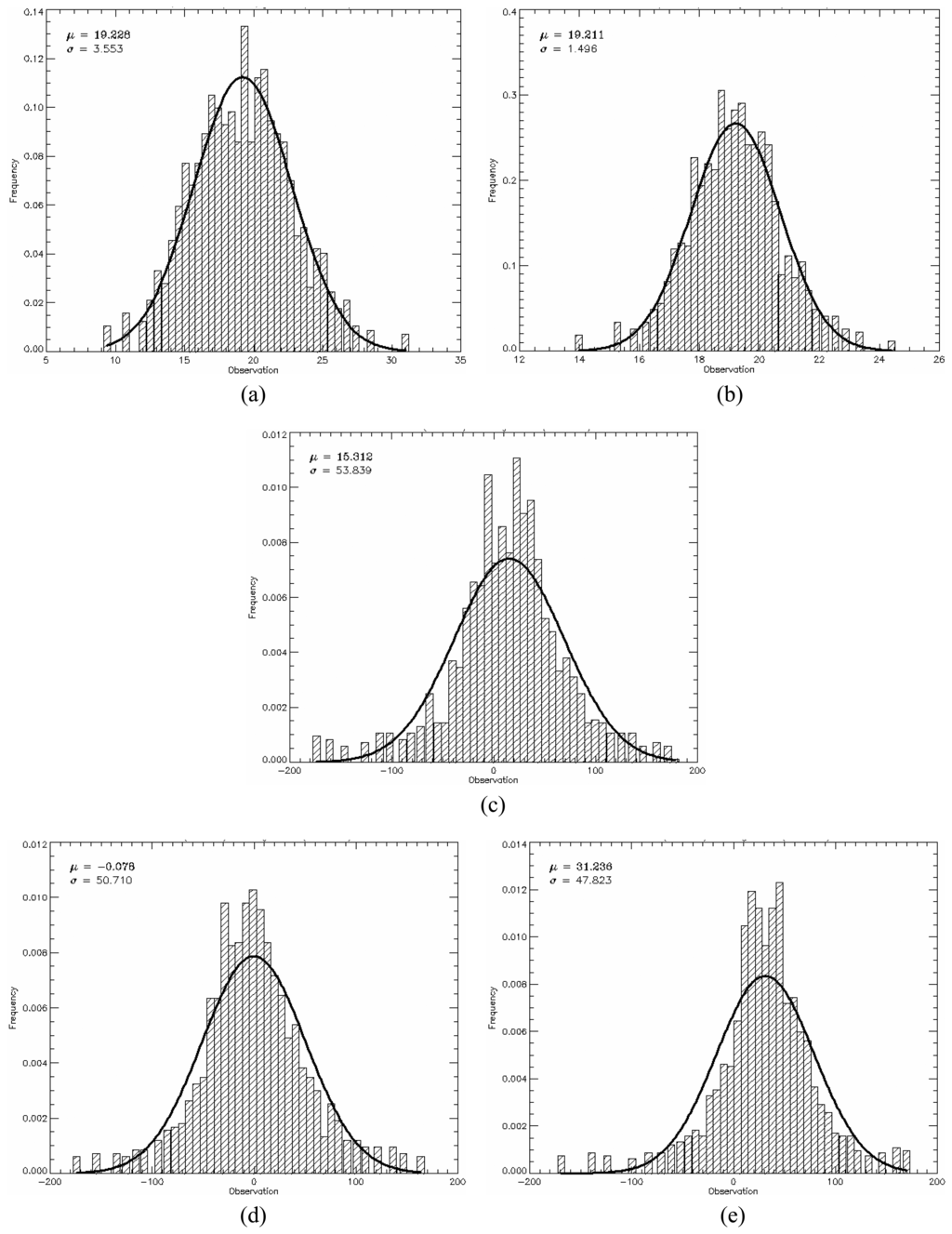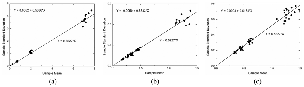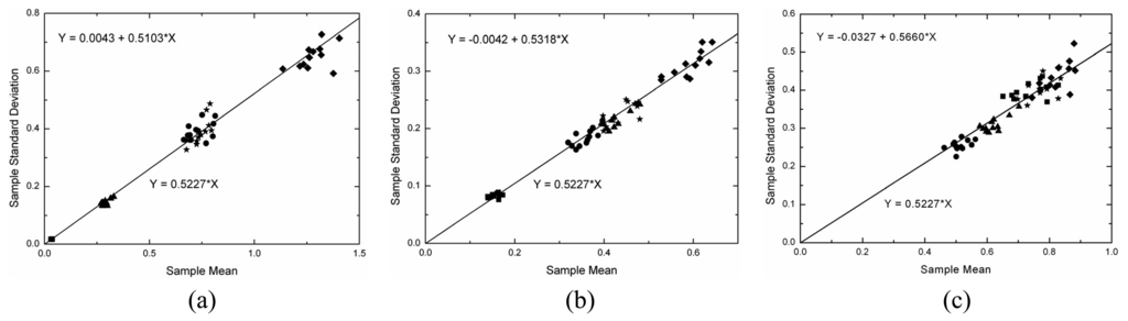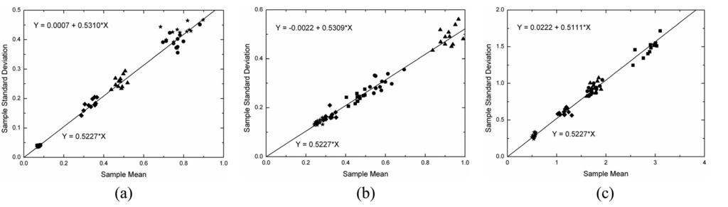 Under the linear detection and for single look data the ratio of the standard deviation and the expected value (the Cv) over homogeneous area is constant and equal to [(4-π)/π]1/2 = 0.5227. This value can be obtained from the moments of the Rayleigh distribution, which is a particular case of the square root of gamma when ENL is equal to one. As a consequence, another simple way of evaluating the simulated data is to check whether the mean value (μ) and the standard deviation (σ) of the data holds the linear relationship σ= 0.5227×μ within homogeneous area. This analysis was performed by applying a simple linear regression model [] to the estimated means and standard deviations for all samples in each channel that were properly fitted by a square root of gamma distribution. The fitted linear regression model states that Y = b0+b1×X, where b0 and b1 are the estimated intercept and slope, respectively. In the case under analysis it is expected that the intercept should be zero and the slope should be equal to 0.5227.
