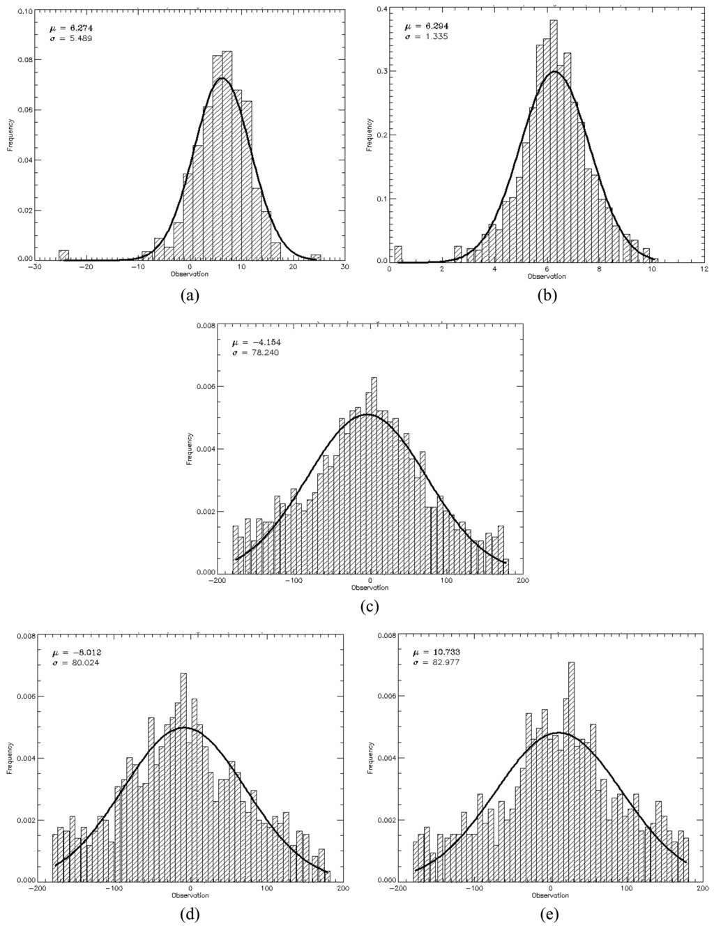 The adjusted linear model (Y = b0+b1×X), where Y represents the standard deviations and X the mean values, and the expected linear model (Y = 0.5227×X) are depicted on Figures 15 and 17, respectively for L-, C- and X-bands in each channel. In these figures the straight line is represented by the expected linear model and the symbols follow the same legend adopted in Figure 11, i.e., the square, the triangle, the circle, the star and the diamond represent the regions A, B, C, D, and E, respectively. The obtained straight line for each channel is not shown in these figures because it is very close to the expected one. By observing the Figures 15,16 and 17 it can be noted that the estimated values for the intercept (b0) are always around zero and, in general, the values of slope (b1) are over estimated, but around the 0.5227 value.