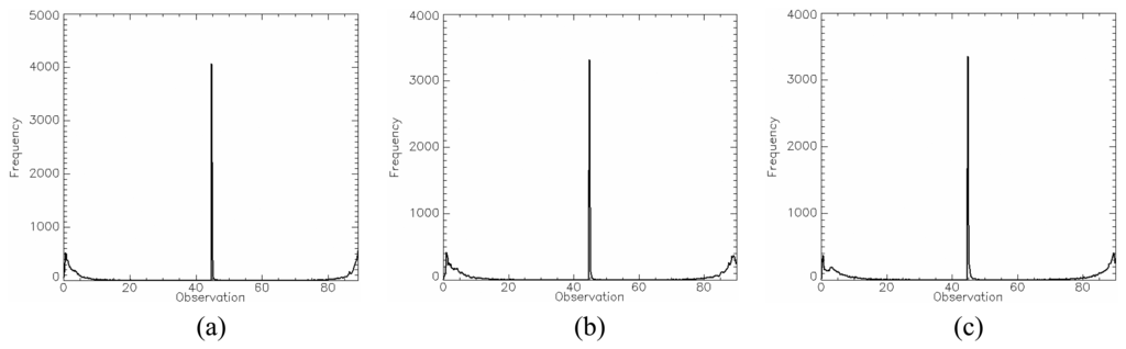 Alpha image histogram: (a) L-, (b) C- and (c) X-bands.
