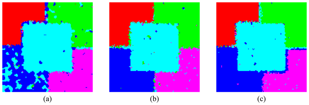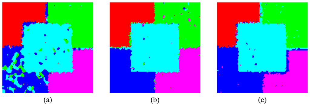 where fξ(zs) is the density associated to class ξ, which has radiometric value zs on co-ordinate s, β is a real parameter that quantifies the influence of the neighboring class and it is estimated iteratively and ∂s is the set of neighboring co-ordinates around site s. The iterative technique stops according to the number of co-ordinates whose classification changes from one iteration to the next []. The expression of L(ξ) can be reduced to the Maximum Likelihood (ML) classifier and to Mode Filter, when β = 0 and β→∞, respectively. For more details of the algorithm, the reader is referred to [, , ].