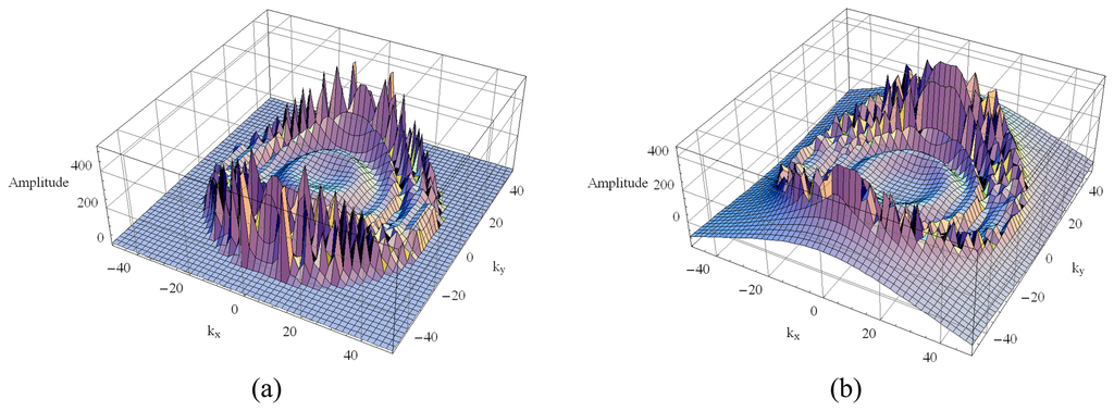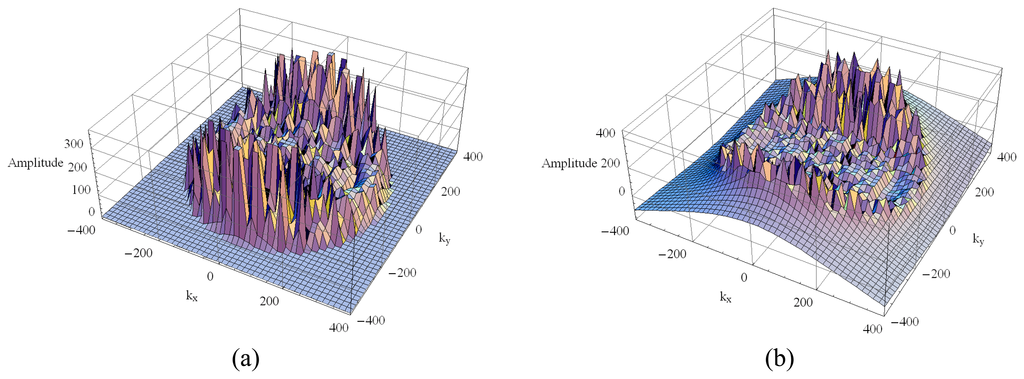 Multifrequency sets of single-look polarimetric SAR images have been generated in the L-, C- and X-bands, corresponding to 1.25, 5.3 and 9.6 GHz respectively. The acquisition geometry is particularized for a monostatic sensor flying at an altitude of 6,000 m (airborne platform altitude) and 35° grazing angle imaging a 290 m × 290 m area terrain. For this imaging geometry, the look angle between near- and far-range changes less than 1°, that is a small variation around of the look angle at the center swath width. The 3.0 m spatial resolution and 2.8 m pixel spacing were set in the range and the azimuth directions. In the simulation process the elementary scatterer was represented by a 50 mm × 1 mm electric dipole printed on the interface z = d2 (see the structure in Figure 2). A 9 × 9 pixels square window was used to determine the neighborhood for the estimates of sinc(.) function weights.