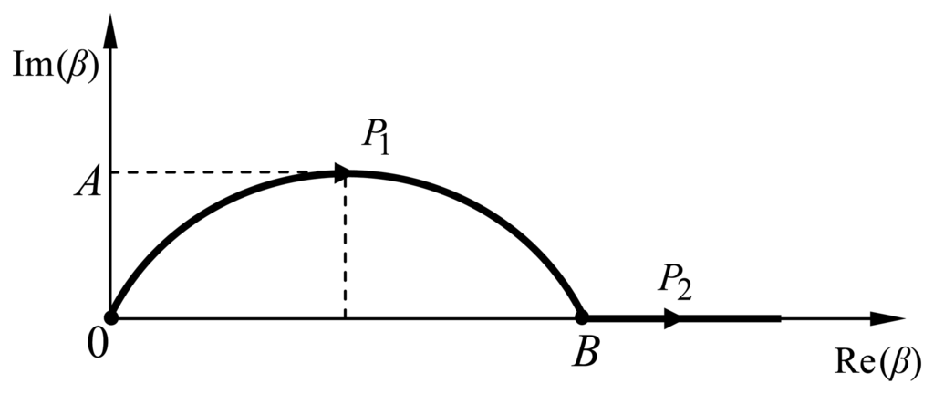The first double integral of (27) could be computed by a singularity extraction method, however this technique requires the calculation of residues and Cauchy principal values at the singularity points. A major problem in computing the poles' contribution is finding the accurate location of all poles in a region. Since the number of poles and their locations are not known beforehand [], the use of a deformed path to compute the integrations seems to be an efficient way to avoid this problem. Therefore, in this work a parabolic path was chosen to compute the integrations over the interval [0, B] and then proceeding along the Re(β)-axis from B to ∞, assuming there are no singularities in the latter interval. The deformed contour P, which is defined by P1 and P2 paths, is depicted in Figure 5, where P1 represents the parabolic path and P2 the path along the real axis. The advantage of contour P is avoiding numerical integration near the poles. Further, no knowledge of the number of poles and their locations is required. Generally, the values of parameters A and B are, respectively, about 0.1k0 and 1.1k0εrm, where εrm = (max{εr1, εr2})1/2.
