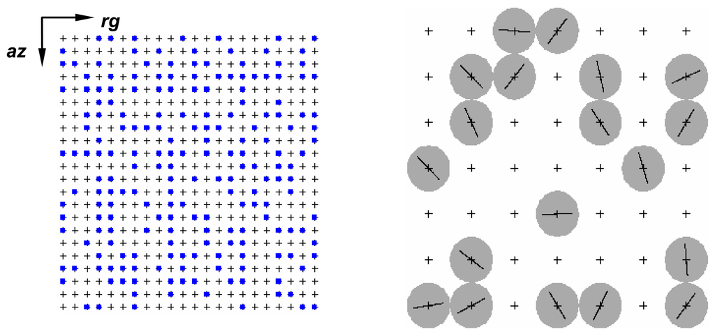 Image generation begins with the definition of a regular rectangular grid of coordinates over the scene to be imaged. The grid size is determined by the dipole size and by SAR operational parameters, such as spatial resolution, pixel spacing and the extension of the area to be imaged. The coordinates of the rectangular grid determine the possible positions that any structure can occupy. Mutual interaction among the dipoles can be avoided by the definition of a guard band around each one. In Figure 6 is illustrated a rectangular grid showing a few selected dipole positions (blue points) and a zooming part depicting the guard band (gray circle) and the dipole orientation. In the simulation process it is assumed that there is no dominant scatter in the image. In addition, according to [] six elementary scatters are sufficient, in practice, to the components in-phase (I) and quadrature (Q) of received backscattered signal have Gaussian distribution with zero mean and equal standard deviation σ. Taking this statement into account, the simulation process used in this work guarantees at least fifteen elementary scatters within each resolution cell. The position and the local orientation of the dipoles, in the xy-plane, are uniformly distributed; their local orientation is distributed over the interval of 0° to 180°.