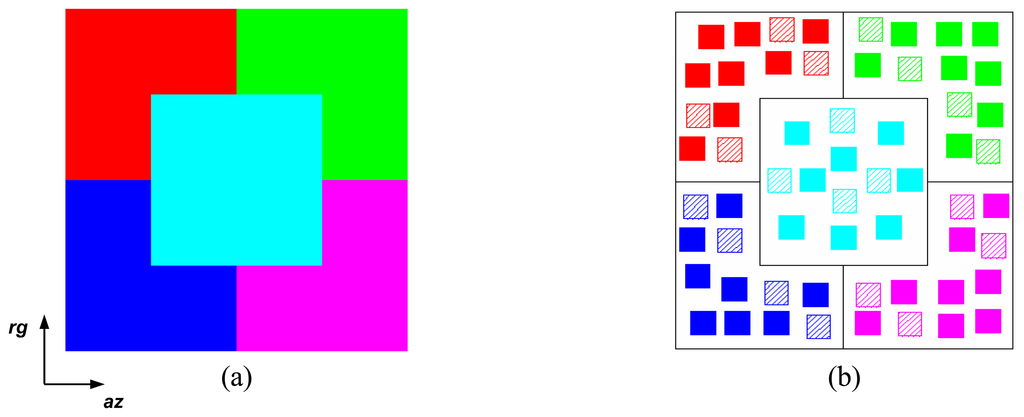 According to [], the next challenging era of satellite programmes are the Cartwheel satellites, consisting of a transmitter and several small receivers for a specific purpose. This technique is completely based on the bistatic behavior of radar waves for different targets. Therefore, there is currently a need to perform such bistatic radar measurements for various kinds of targets and to develop a less complex model for the retrieval of the target characteristics. There are currently in the literature few works that have used the polarimetric analysis of bistatic radar data to retrieve target parameters, such as []. Although the SAR image simulation process proposed here can be used in either monostatic or bistatic SAR framework without any additional complexity, this paper assumes the monostatic framework to simulate polarimetric SAR images.
