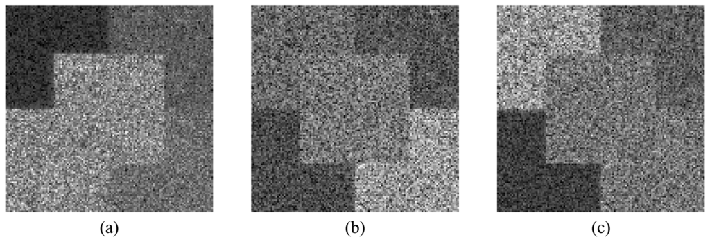 X-band amplitude simulated polarimetric SAR images: (a) HH, (b) HV and (c) VV channels.